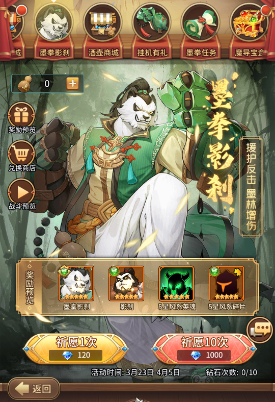 奖励简介:在【墨甲拳心】活动中可获得【钻石】、【墨林酒壶】、【SP英雄墨拳影刹-限时7天体验卡】奖励!