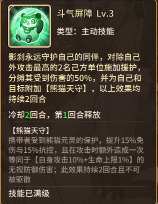援护效果也有高达50%的系数,能够分摊大量的伤害,但是美中不足的是对分摊伤害没有减免,这对熊猫本身的生存能力是一大考验。