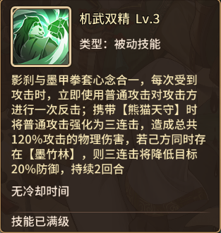 魂器20级:【斗气屏障】Lv3【熊猫天守】提升携带单位15%普通攻击伤害,额外攻击伤害系数提升至【自身攻击12%+生命上限1.2%】