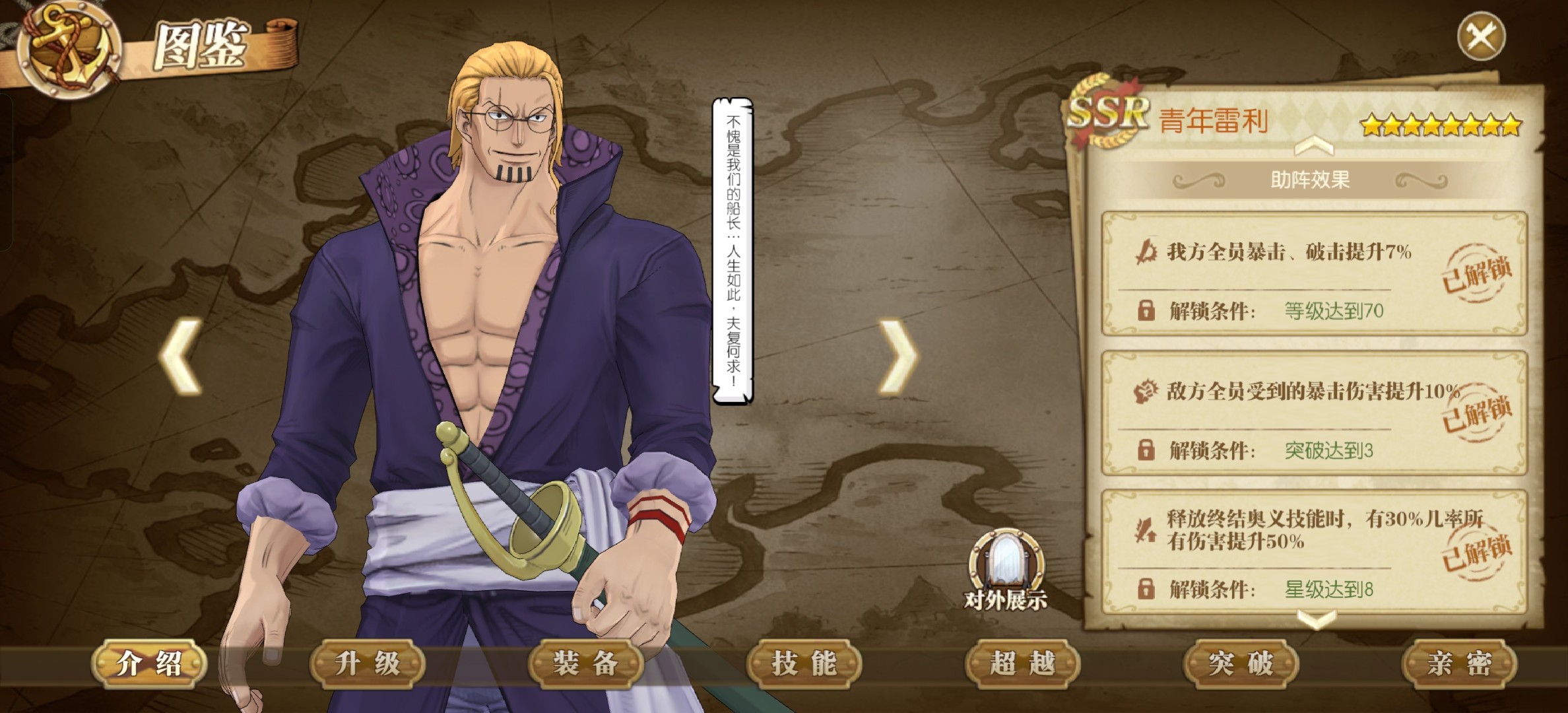 青年雷利也是7%的破击,不过他增加的是暴击,和对对面的暴击伤害提升,不过在天梯中依然是作用不大。