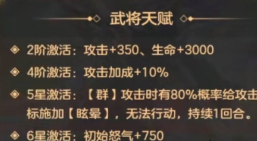 ⭐:群:当吕布处于群雄阵营时,攻击时有80%的几率触发眩晕。持续一回合。