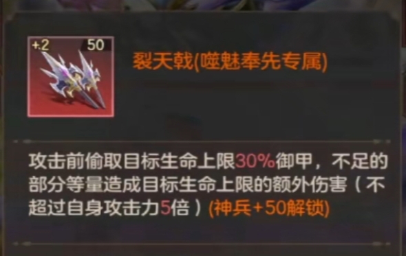 50级神兵:吕布可以偷取敌方30%的御甲效果,不够的部分等量换取目标生命上限伤害。