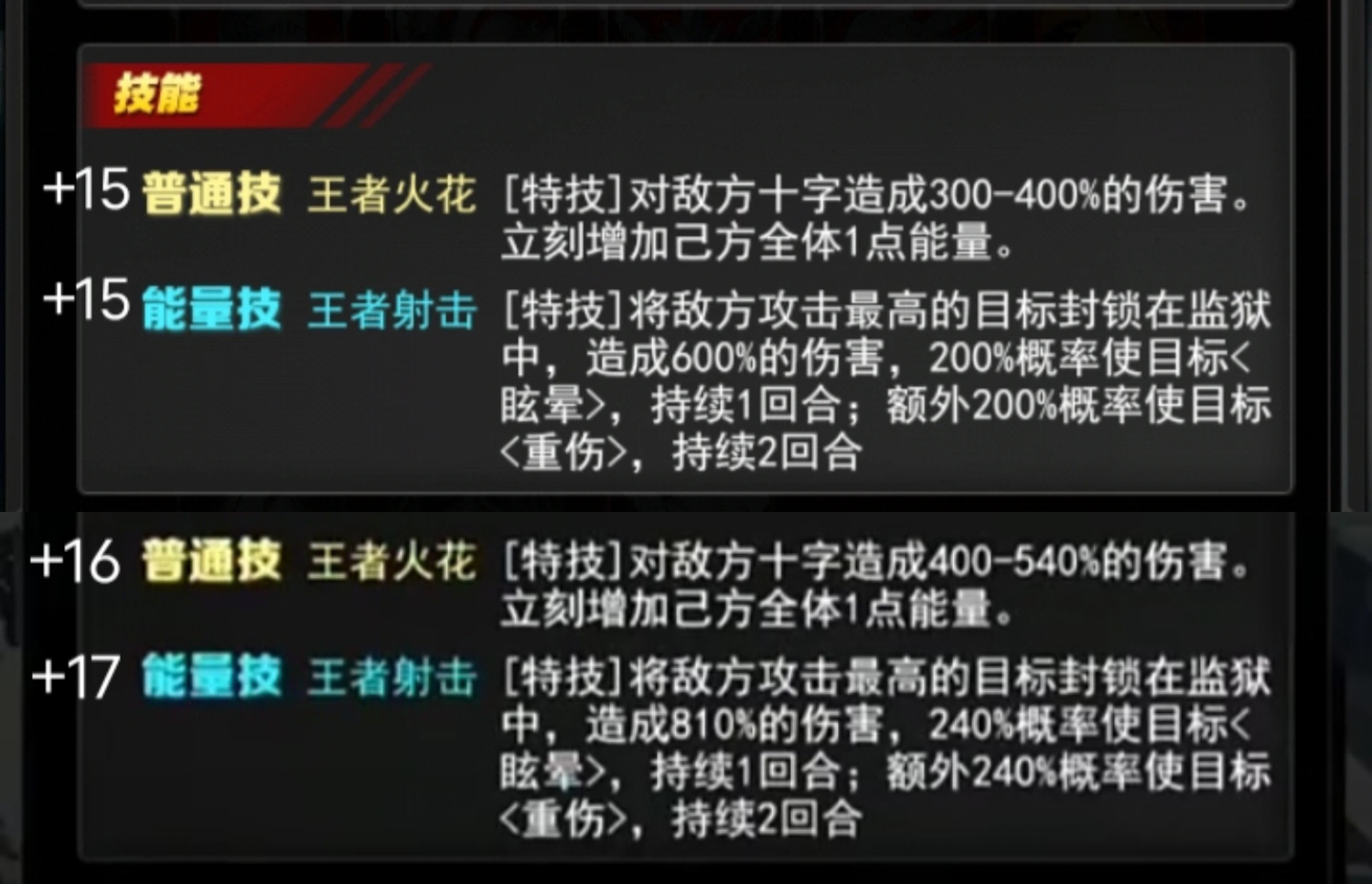 +16 普通技 王者火花[特技]对敌方十字造成400-540%的伤害。立刻增加己方全体1点能量。