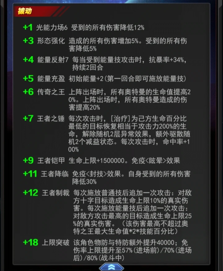解析:普攻后对敌方十字追加百分之10生命上限伤害。能量技后对敌方攻击最高附带25生命百分比真伤也就是一个大招普通追击奥王输出已经不是靠能量技和增伤了,这个被动是奥王主要输出手段总体来说还是相当不错的