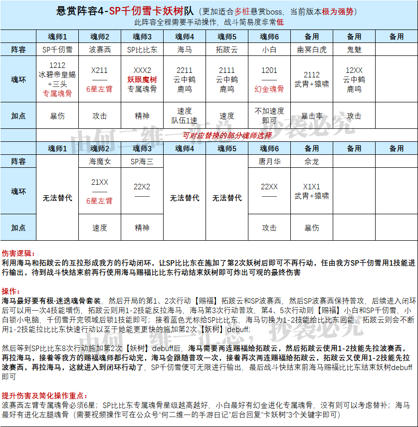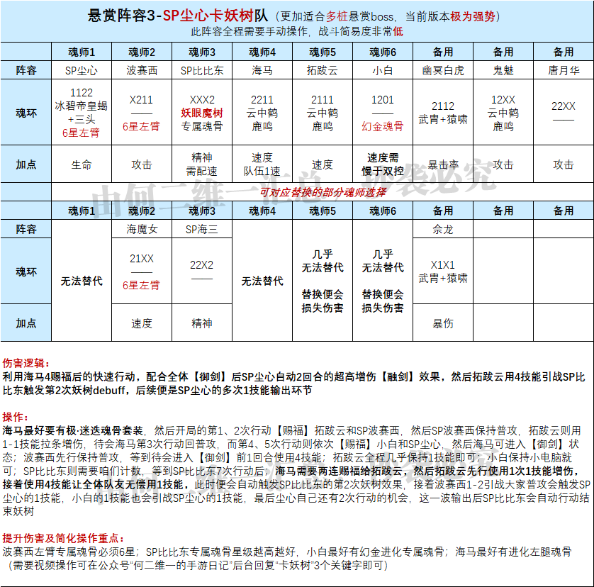 卡妖树阵容需要我们具有非常高练度的【妖眼魔树】魂环才可以行之有效,至于这个高练度的判断门槛,维一个人认为是至少达到20万年以后大家再行使用会有不错的效果,因为没有达到这个门槛,很有可能我们辛辛苦苦操作了5分钟,最后连个常规半自动阵容打的伤害都不如......这点也特别要给大家说一声
