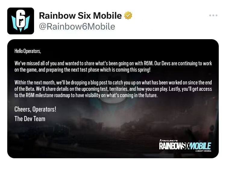 快报📰!快报📰!近日育碧彩虹六号IP手游《彩虹六号M》官方推特发布了一则新的公告,宣布游戏的下一轮海外测试将在今年春季开展,具体时间暂未透露。
