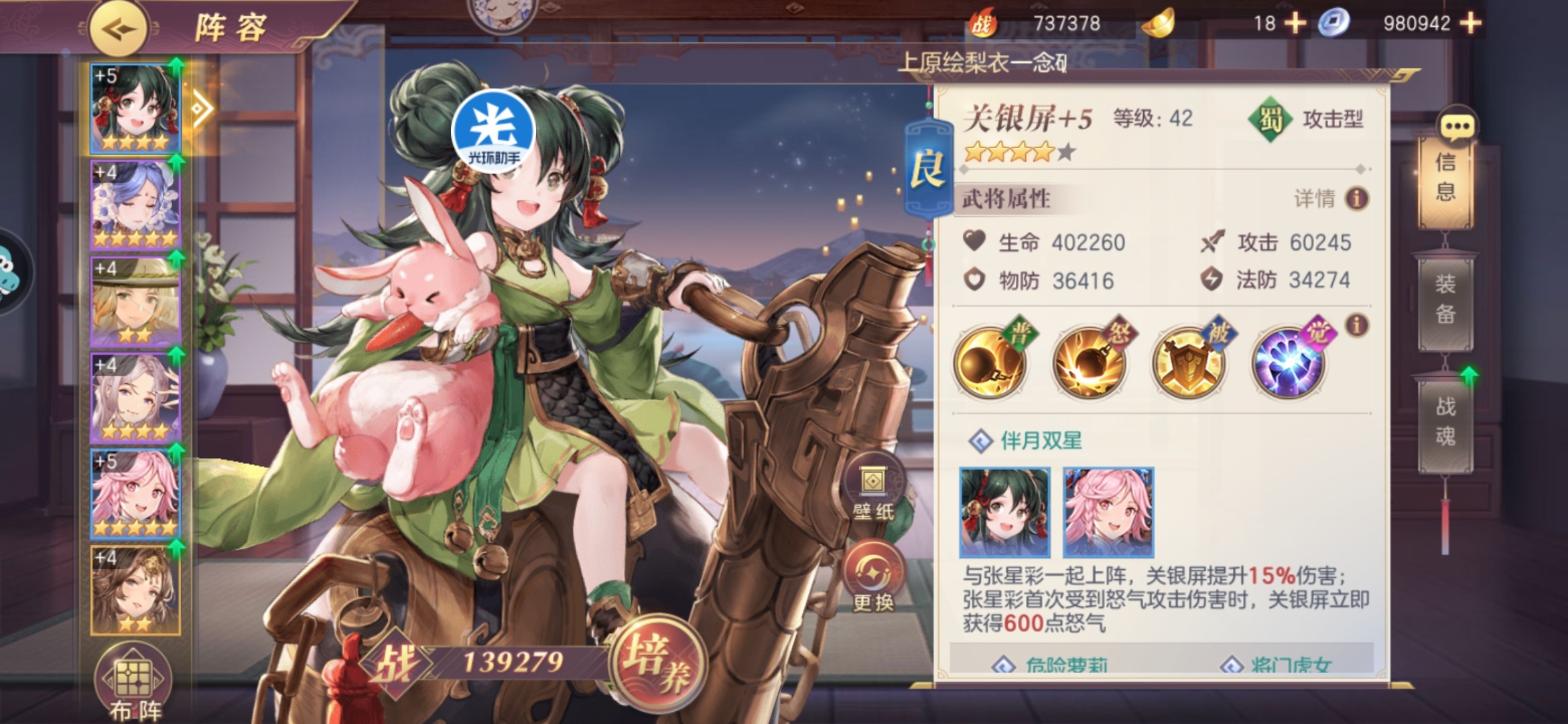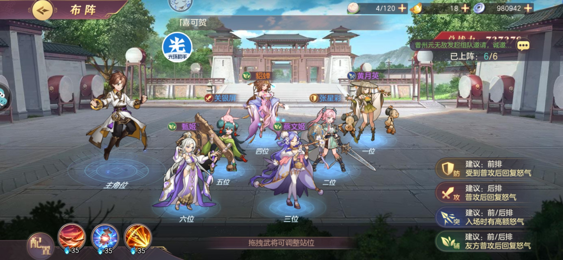 保持阵容与之前差不多,这里继续上阵黄月英的原因主要是我的主c目前以小关张作为核心,黄月英可以增强蜀国武将的战斗能力,其实就是因为没有孙尚香。