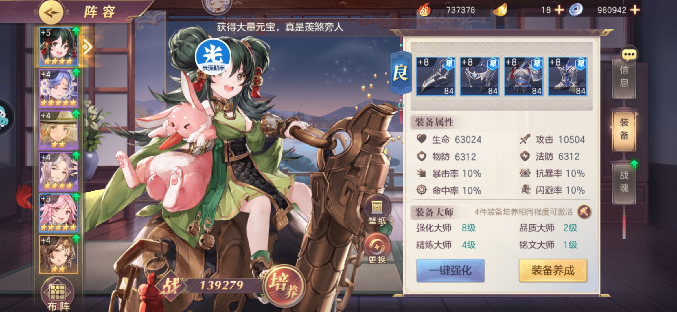目前我的全部装备培养,小关精炼8,其余精炼4,小关七天乐平民的女王。