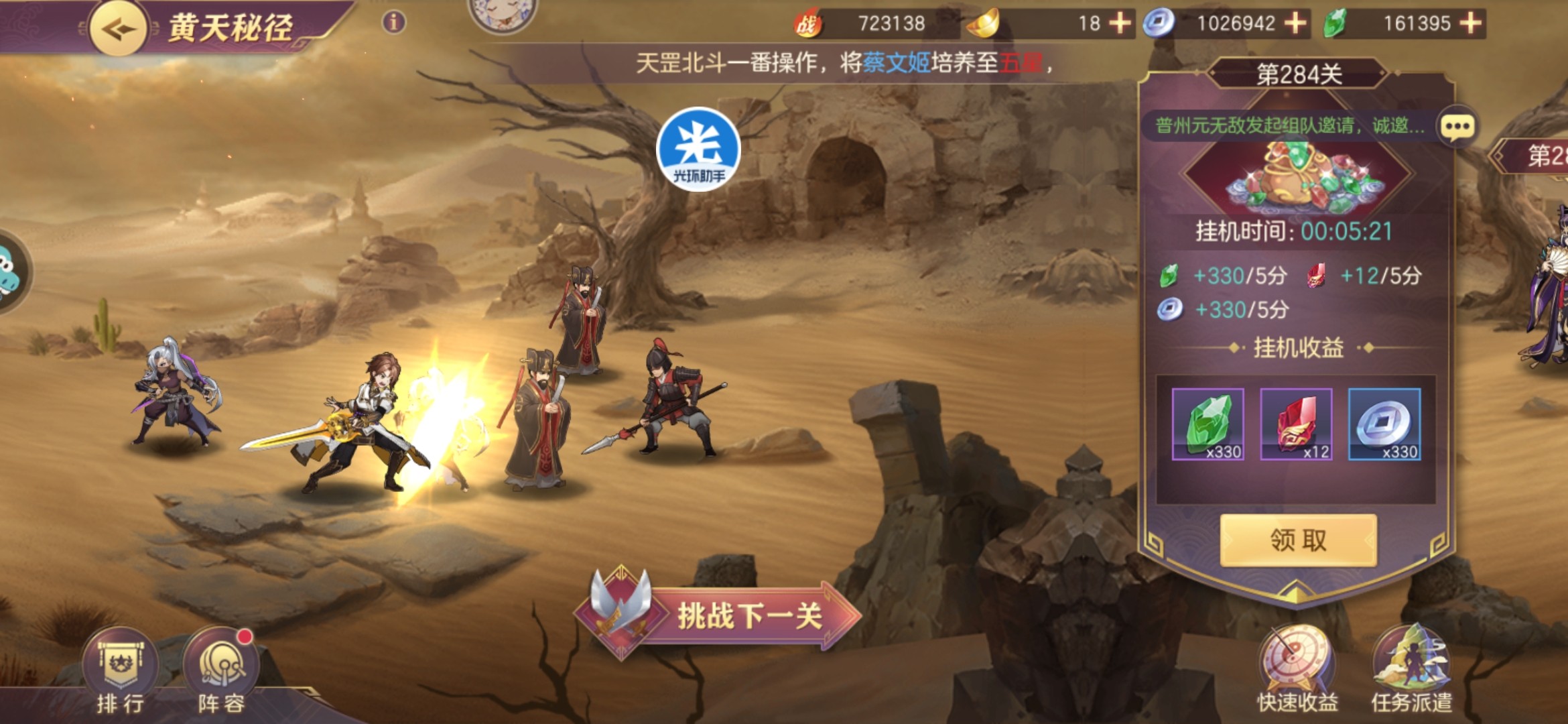 3、用女队,小关张、蔡文姬玩法,10万战开区1小时左右可以一路打到前十,竞技场任务完成。