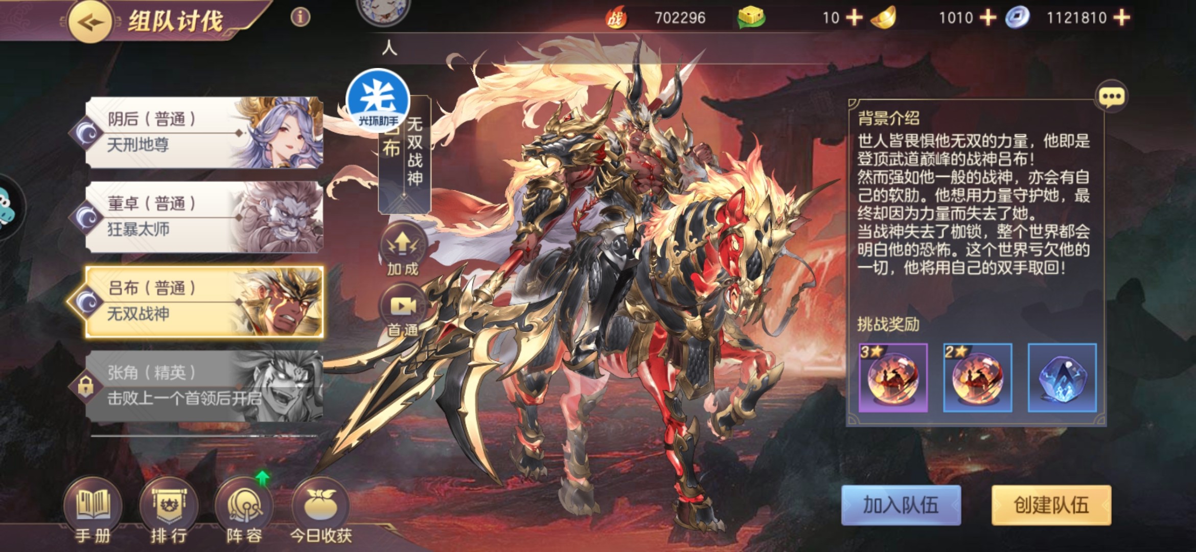 65到70女队可以单人通关吕布的,不过组队通关建议90万再尝试,要不过