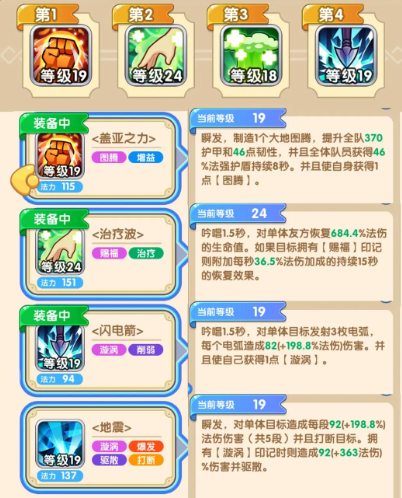 技能加点:学习技能的话推荐按照“盖亚之力”→“治疗波”→“闪电箭”→“地震”这个顺序来,首先盖亚之力无论是学习成本还是效果都属于其中比较好的,首先它的施放是瞬发的,增益能生效的很快,并且效果既提升了双抗,还给予了护盾,保护性直接拉满。治疗波算是她作为奶妈的标配,所以学完盖亚之力后也要立刻点上。