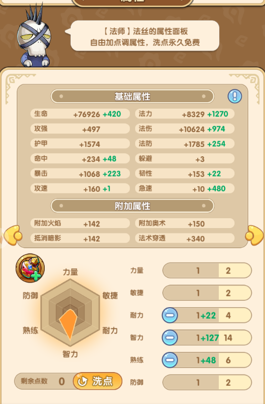 属性加点:既然是法术输出,那么肯定得先拉满智力,因为法丝的技能虽然伤害都比较高,但这些都需要依托于智力所提供的高额伤害加成,另外它的技能有不少也都是需要吟唱的,所以熟练也得点上,最后多余的那些则可以用于提升耐力,增加的韧性和血量都是能够使其的生存能力进一步提升的。
