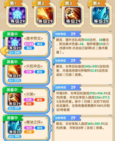 技能加点:加点顺序是“奥术符文”>“火柱冲击”>“火球”>“寒冰之环”,之所以先点奥术符文主要是它可以提供全体范围的法术增伤以及暴击,对于阵中包括自己在内的输出位都有较大提升,另外它所附带的额外回蓝效果也使其在后面施放技能进行法术轰炸时更加有恃无恐。