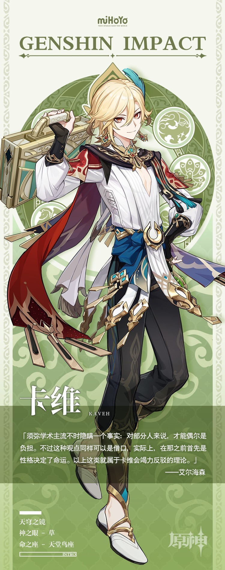 作为设计师兼优秀校友,卡维在教令院学子中名声不小,会被妙论派学弟学妹视为职业楷模。不过很可惜,他的职业生涯并不是人们想象中那么一帆风顺。同样的情况似乎也发生在卡维人生其他方面·。