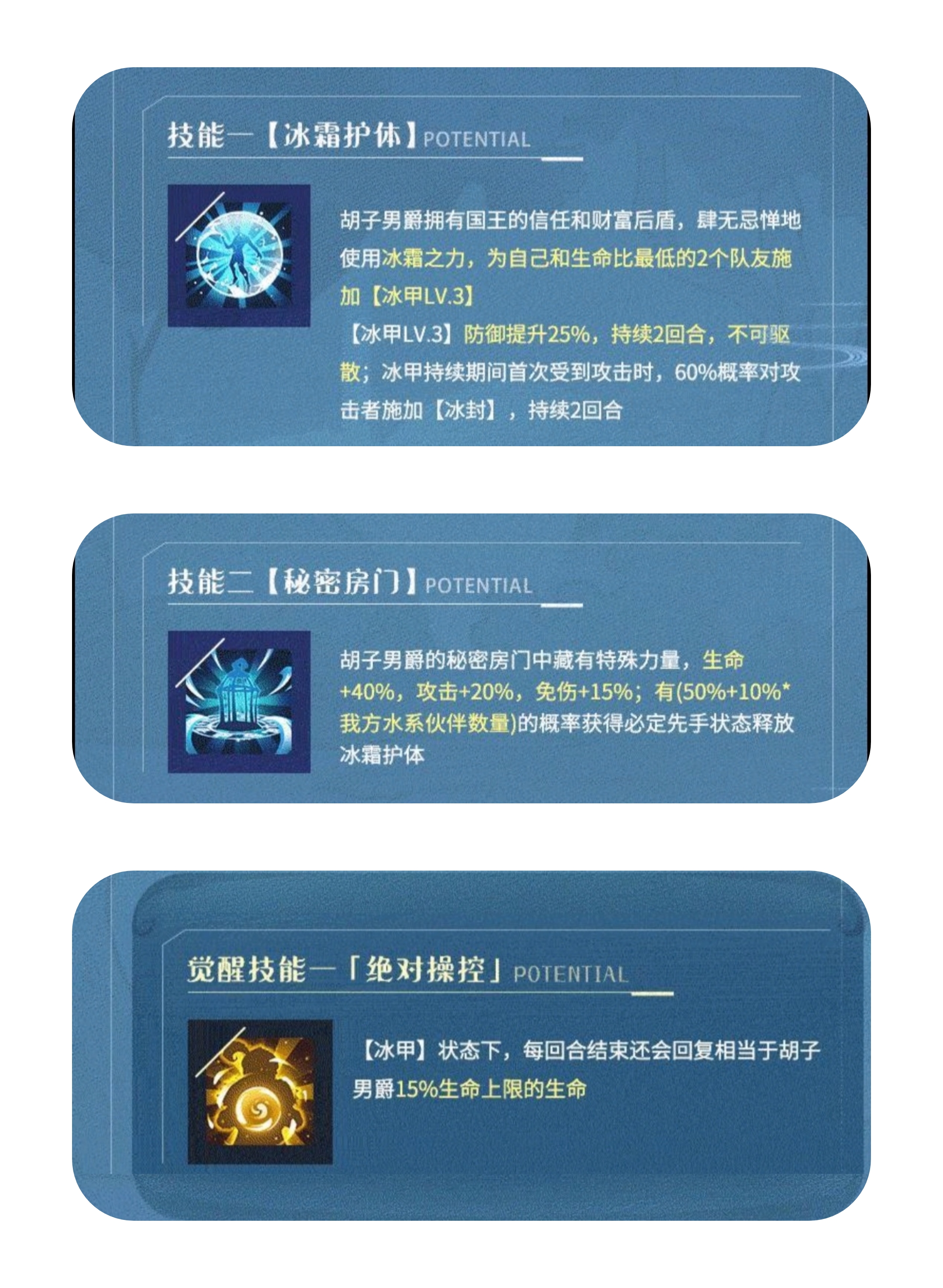 觉醒一:【冰甲】状态下,每回合结束回复相当于胡子男爵15%生命上限的生命。
