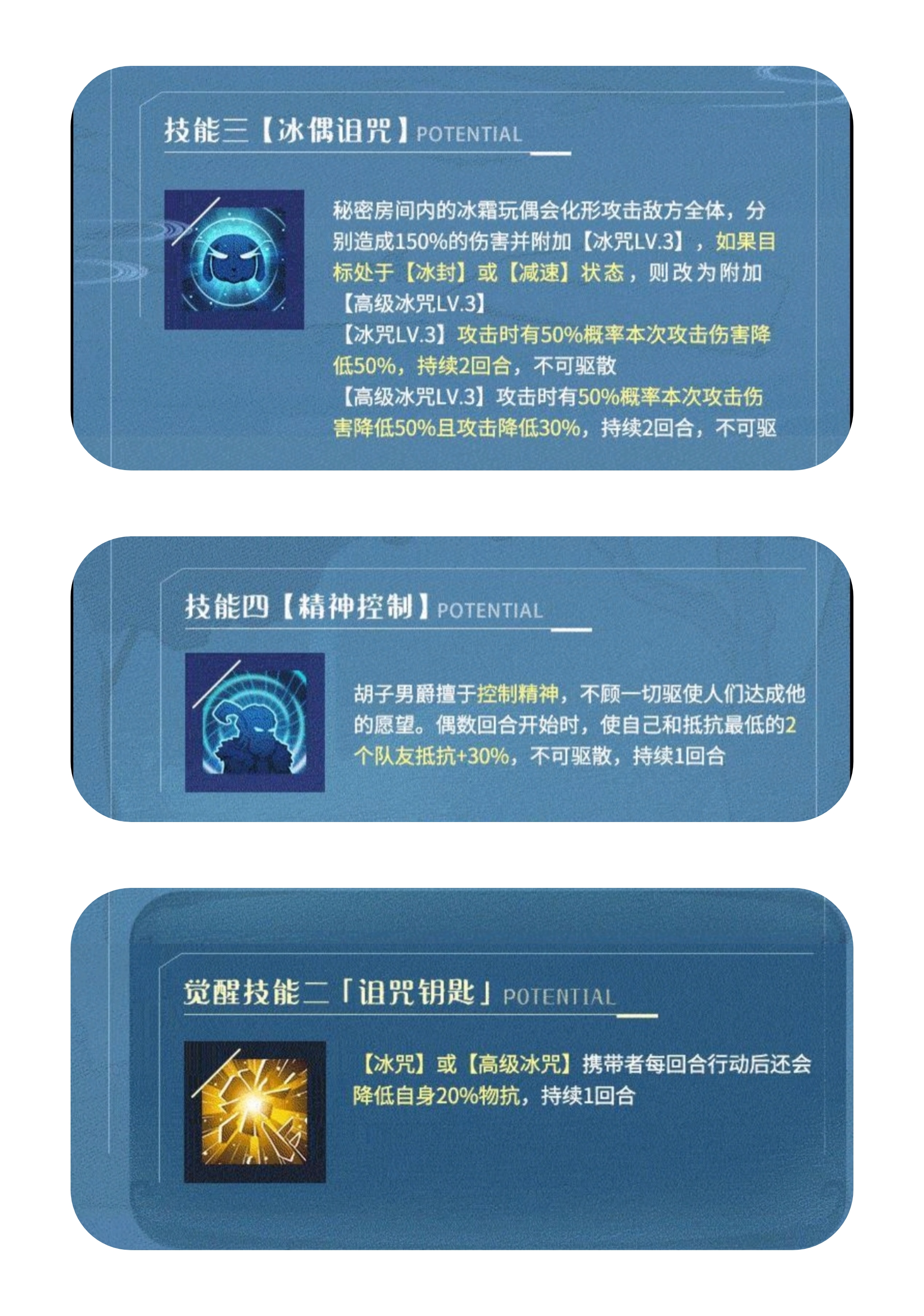 觉醒二:【冰咒】或【高级冰咒】携带者,每回合行动后降低自身20%物抗,持续1回合