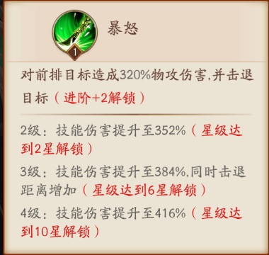 暴怒:对前排目标造成320%-416%物攻伤害,并击退目标,击退距离增加。