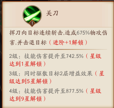 关刀:挥刀向目标连续斩击,造成675%-877.5%物攻伤害,并击退目标,同时驱散目标2层增益效果。