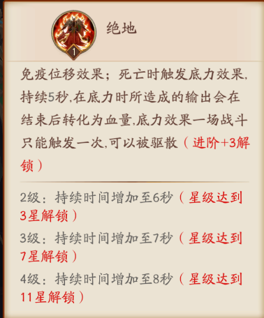 绝地:免疫位移效果;死亡时触发底力效果,持续5-8秒,在底力时所造成的输出会在结束后转化为血量,底力效果一场战斗只能触发一次,可以被驱散。