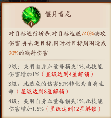 偃月青龙:对目标进行斩杀,对目标造成740%物攻伤害,并击退目标,同时对目标周围造成90%的溅射伤害,关羽自身血量每损失1%,此技能伤害增加1-1.5%,此造成的伤害50%转化为自身生命。