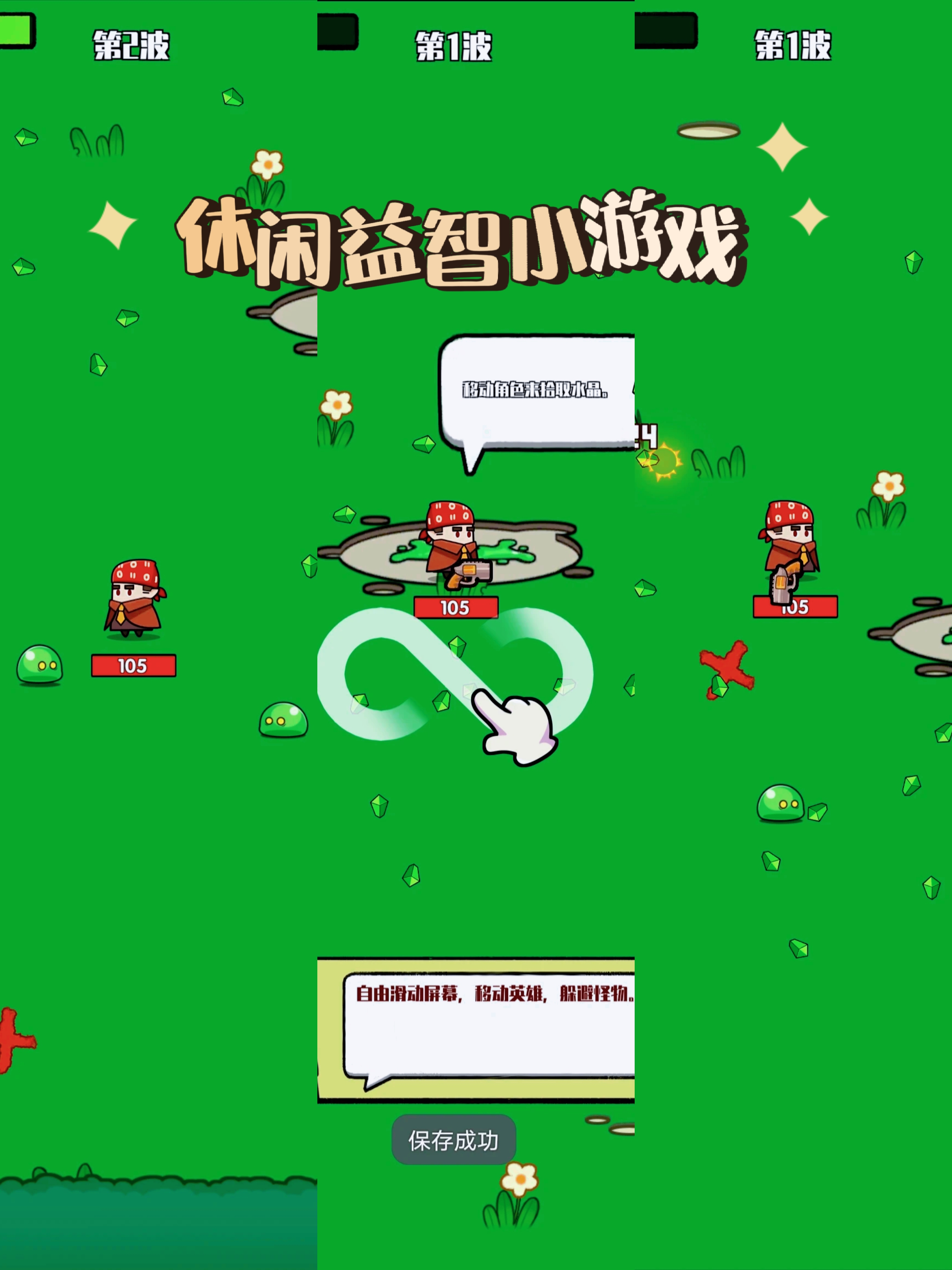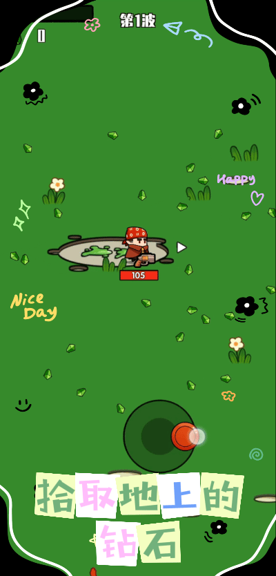 ✍通过滑动屏幕控制角色移动👣,寻找史莱姆并进行攻击💥。史莱姆被击倒后会掉落绿色钻石💎,拾取绿色钻石升级角色等级💡。