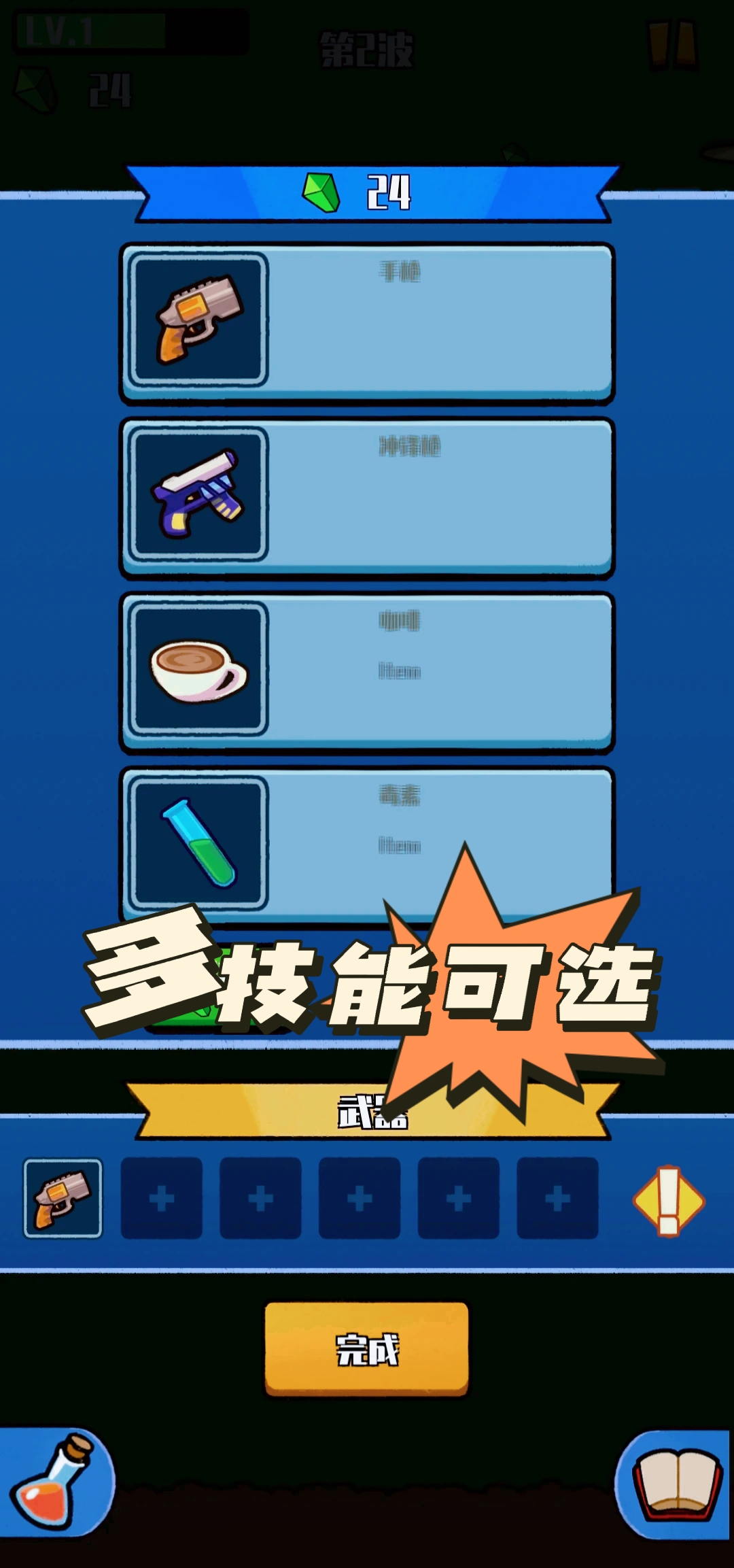 ✍游戏为生存挑战✊,玩家需要尽可能的躲过多轮史莱姆的攻击,💁每躲过一轮攻击就可以获得一次选择技能的机会✌。