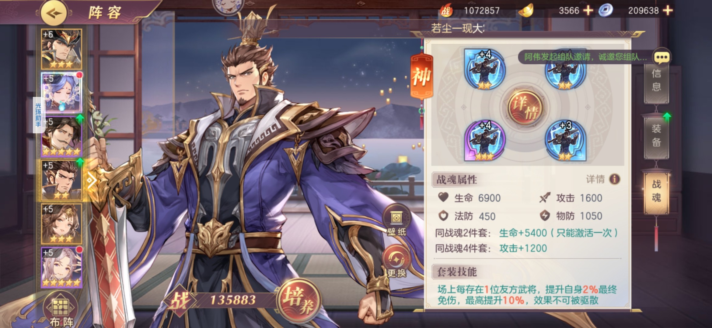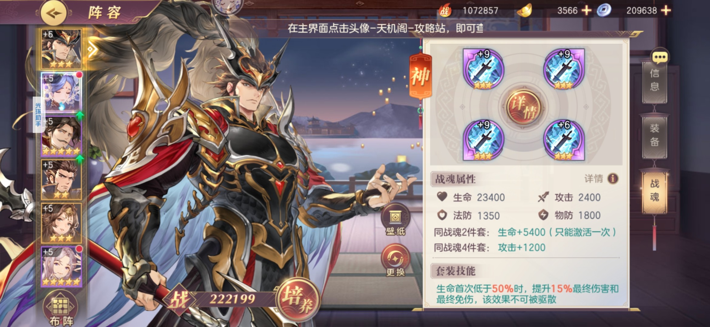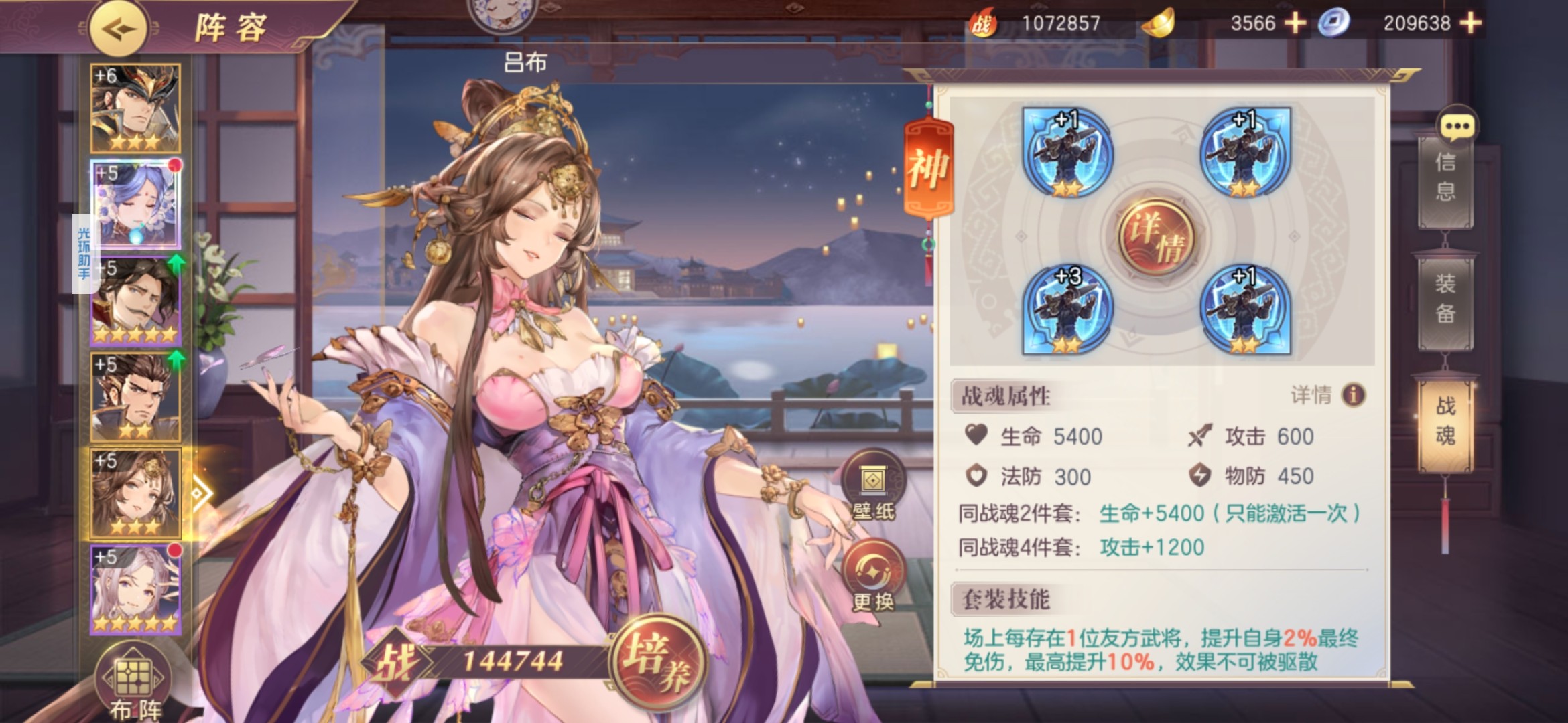 这里吕布战魂佩戴我带的是破釜沉舟,因为我的阵容吕布需要替貂蝉和甄姬分担伤害,所以很快的就可以触发破釜沉舟,再依靠貂蝉、甄姬和蔡文姬把血量再抬上来。