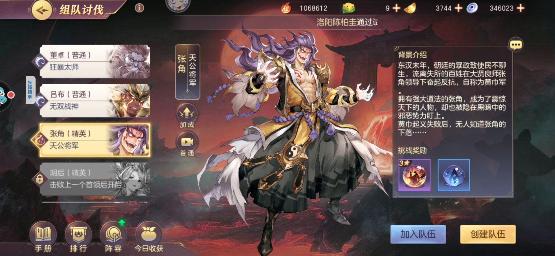 100左右女队可以单人解锁精英张角,不过组队通关建议130万再去尝试,这次不保证过