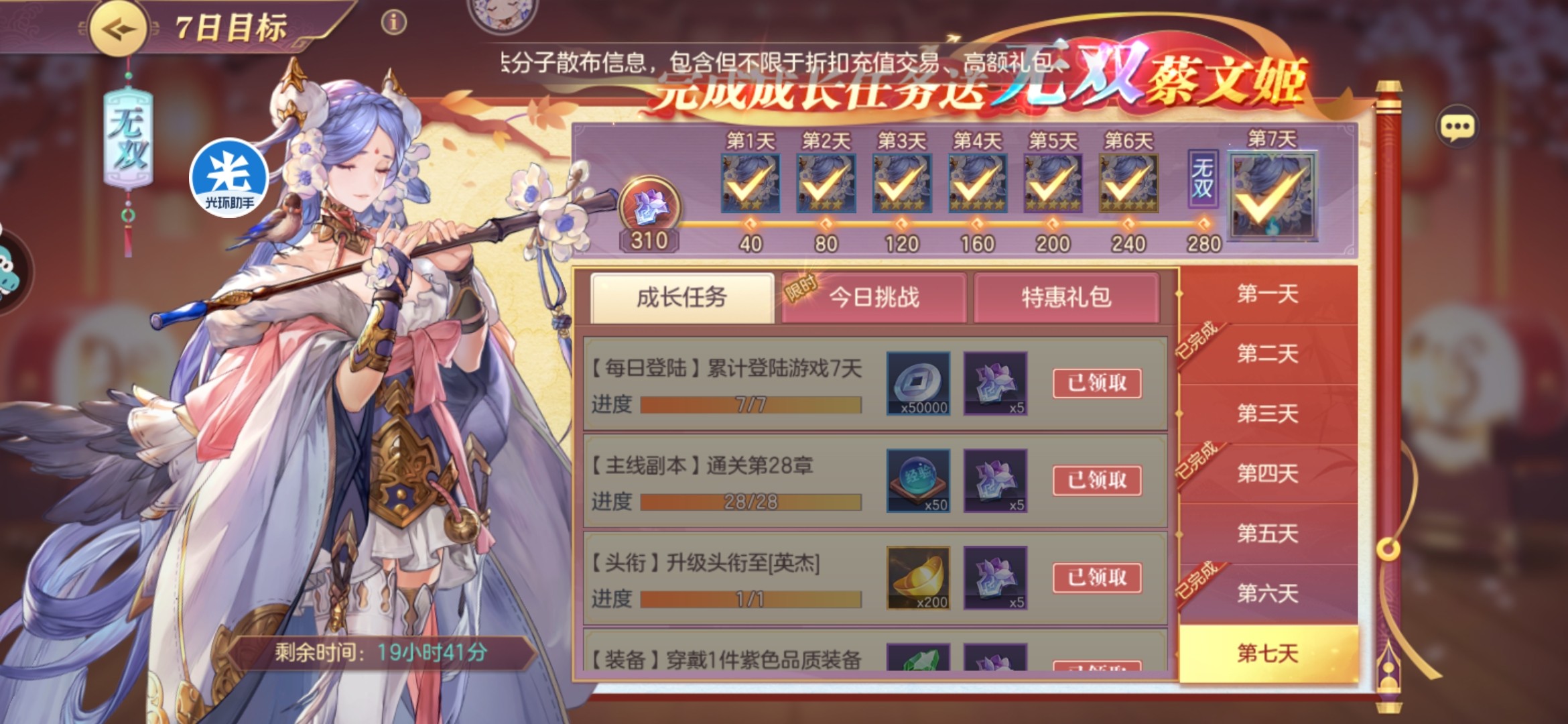 对于获得无双蔡文姬主要是做完成长任务,今日任务不重要,做不做完都无所谓的。这里蔡文姬我算了算最多可以在成长任务放弃4个任务,多了就获得不了了,成长任务一直维持到第七天都可以完成前几天的任务,这个放心。