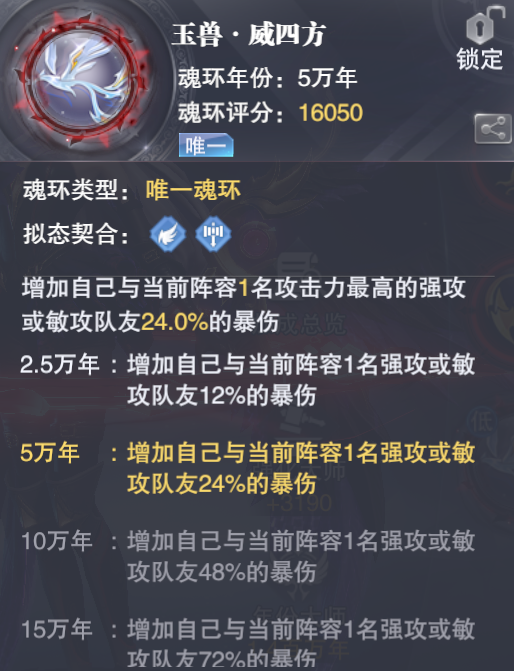 所以客观说如果大家目前依然有在用上述提到的部分阵容,那么这个玉兽系列魂环肯定还是具备不错发挥空间的,其中最需要大家关注的便是【啸千里】和【威四方】这两个加攻击和暴伤的魂环。