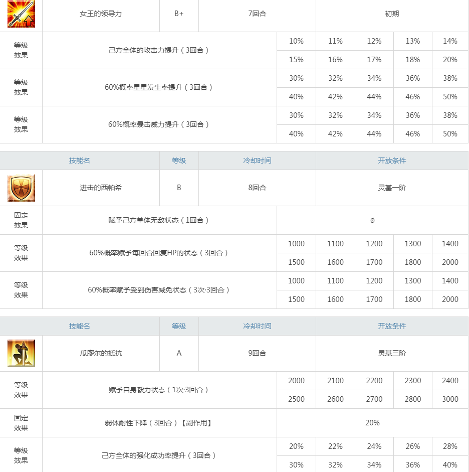 章西女王的技能组,有加攻,有概率出星率,概率增加暴击率,单体无敌,概率回血和伤害减免,战续,副作用弱体耐性下降,看似杂乱的技能组,虽然概率buff这个东西本来在fgo这游戏里是极度不靠谱的存在,但还好有着三技能,全体强化率提升,跟拉二是有异曲同工之妙。有这个强化率提升,章西女王的整体技能不会显得那么鸡肋。