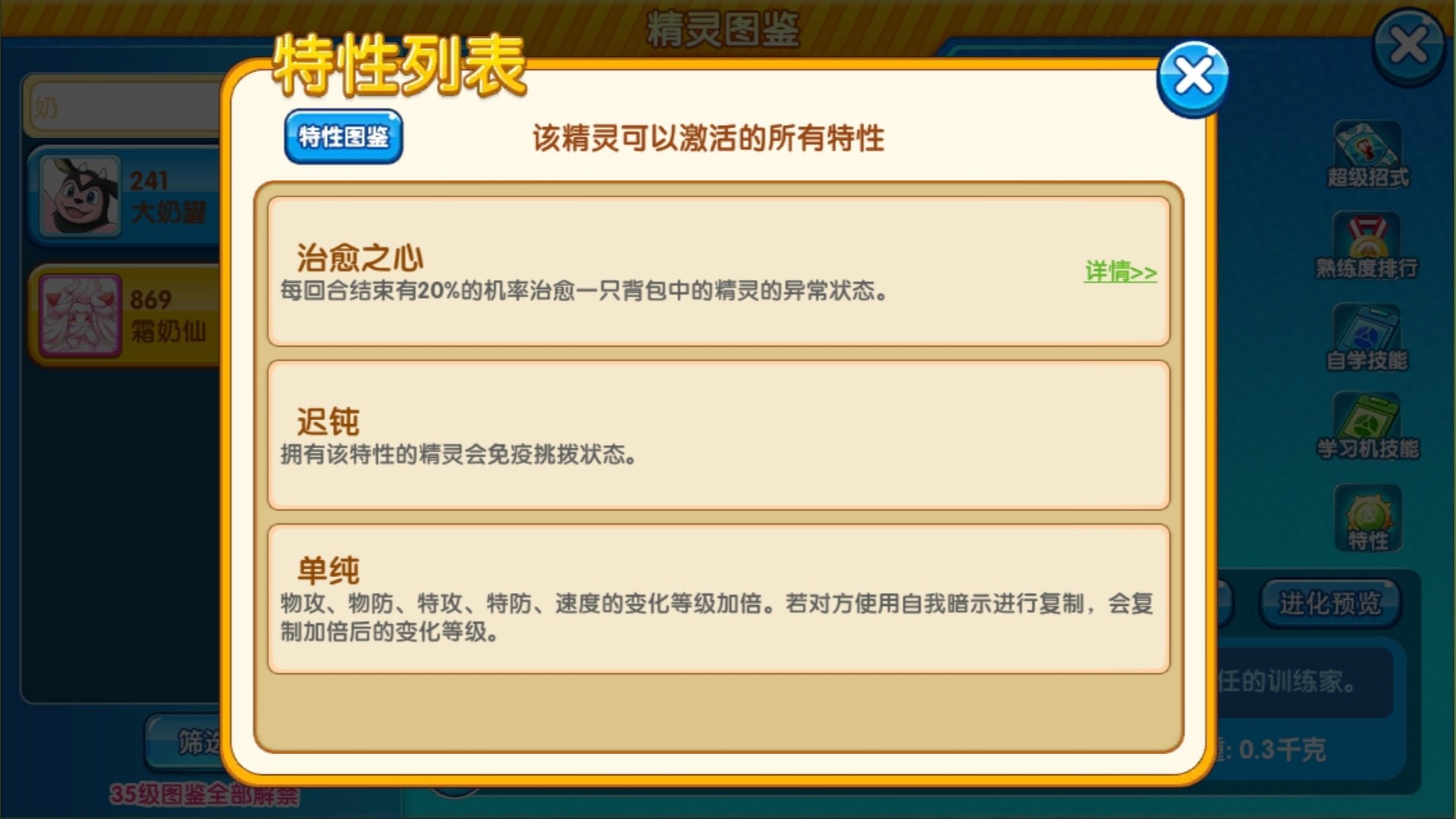 最后一个是单纯,这个是让自身变化等级加倍,这个特性放在强化输出手上是神技能,假如要是给炎烈、毒龙,那直接就强的没边,不过它也有冥想,但是速度太慢,但把它作为一个辅助手,也并不是没有可取之处。