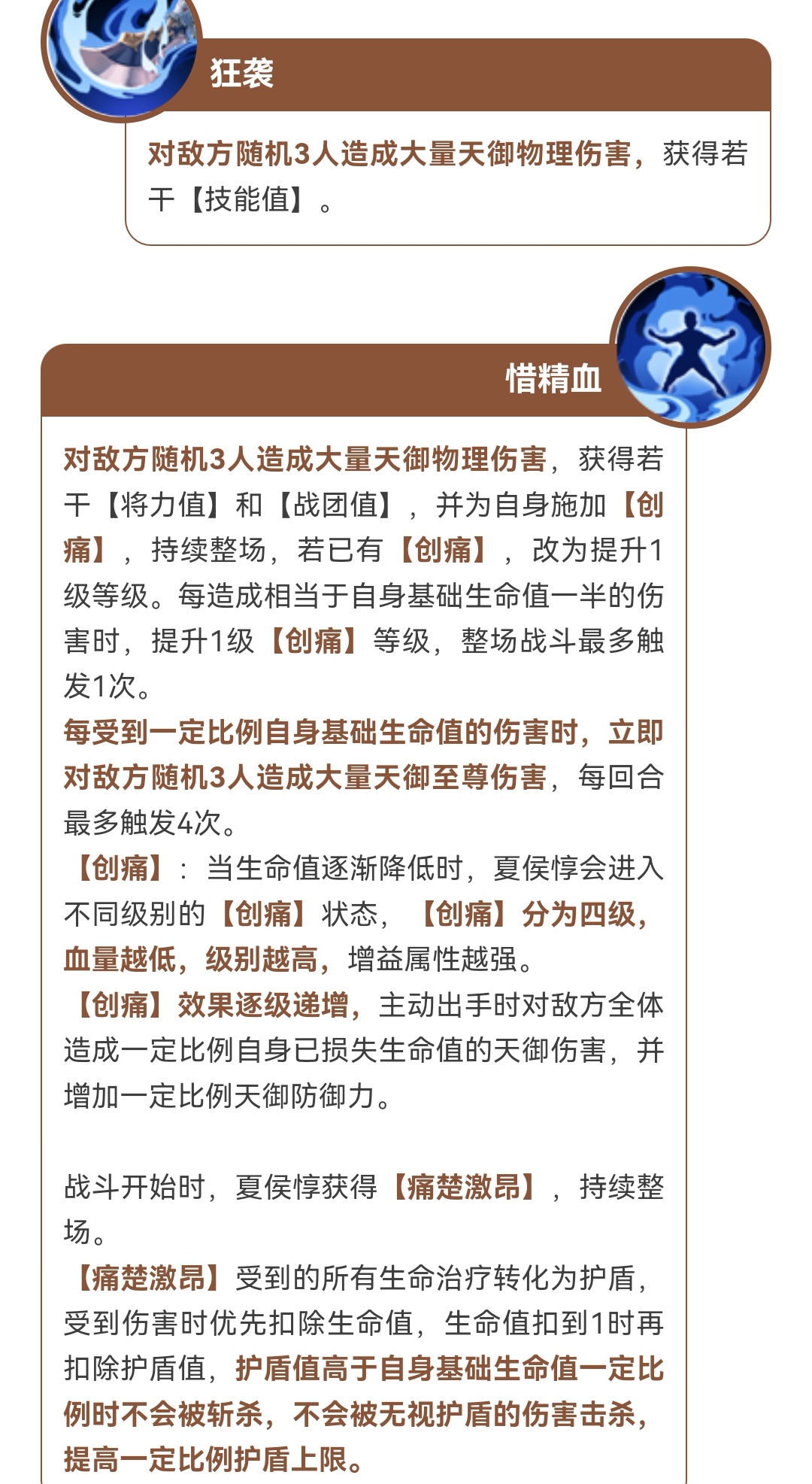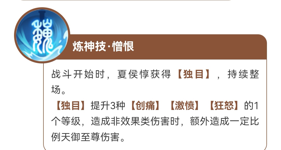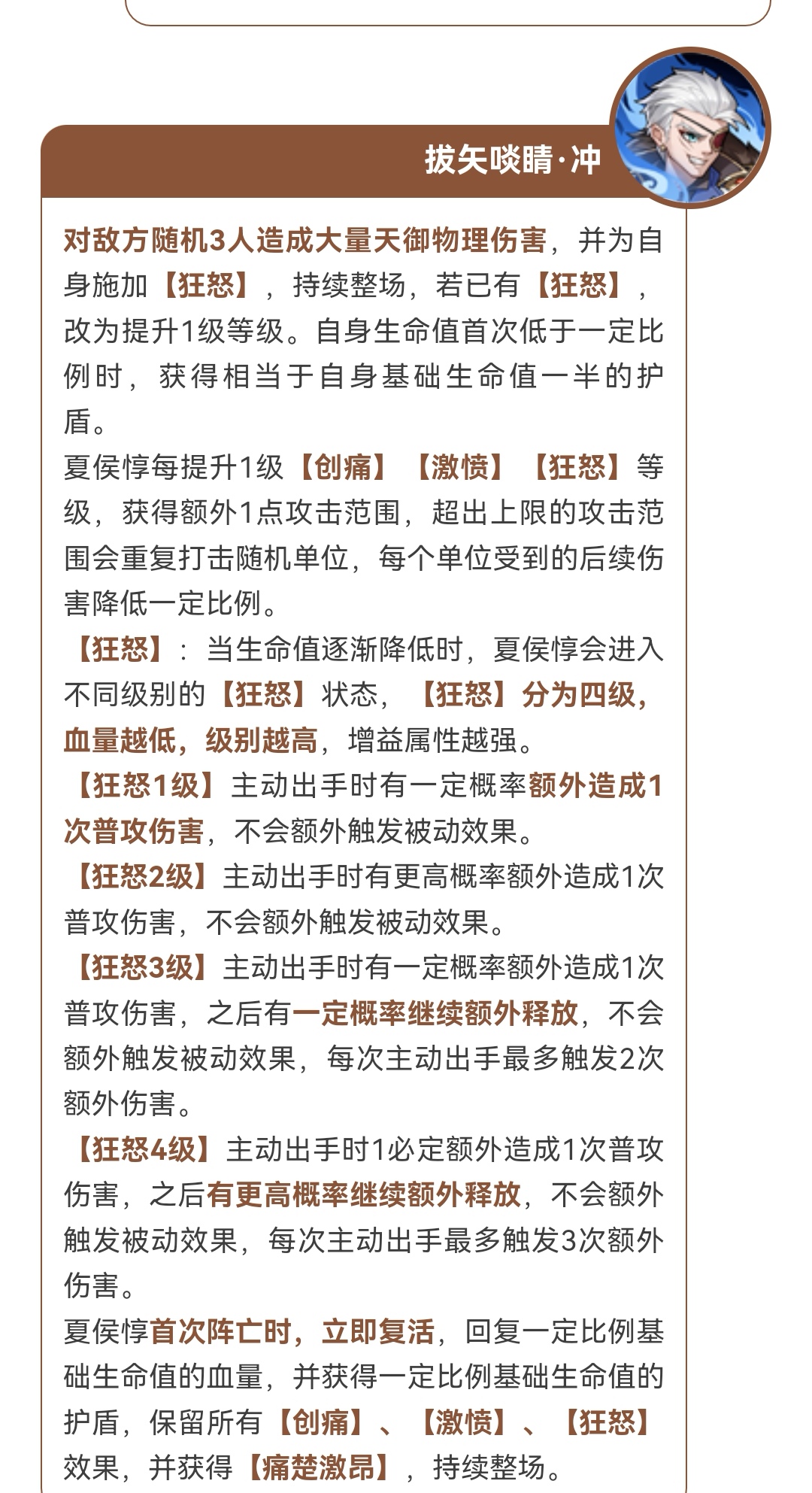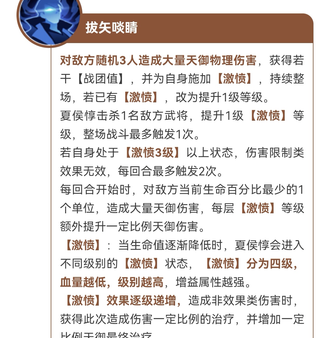 激愤(生命值降低进入不同等级,最高四级,血量越低增益越强。效果逐级递增,造成非效果伤害获得治疗,增加夏侯惇最终治疗)
