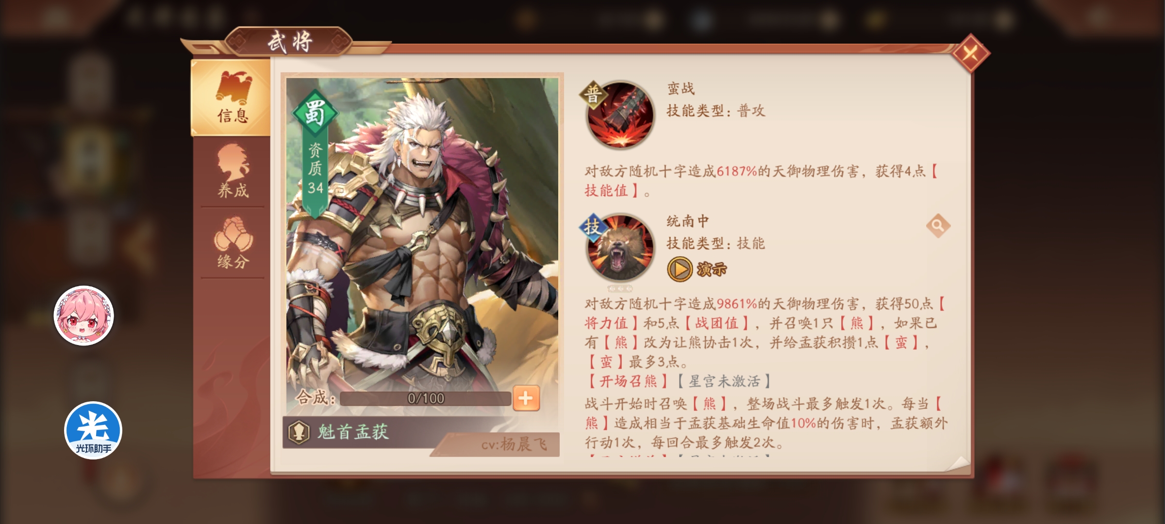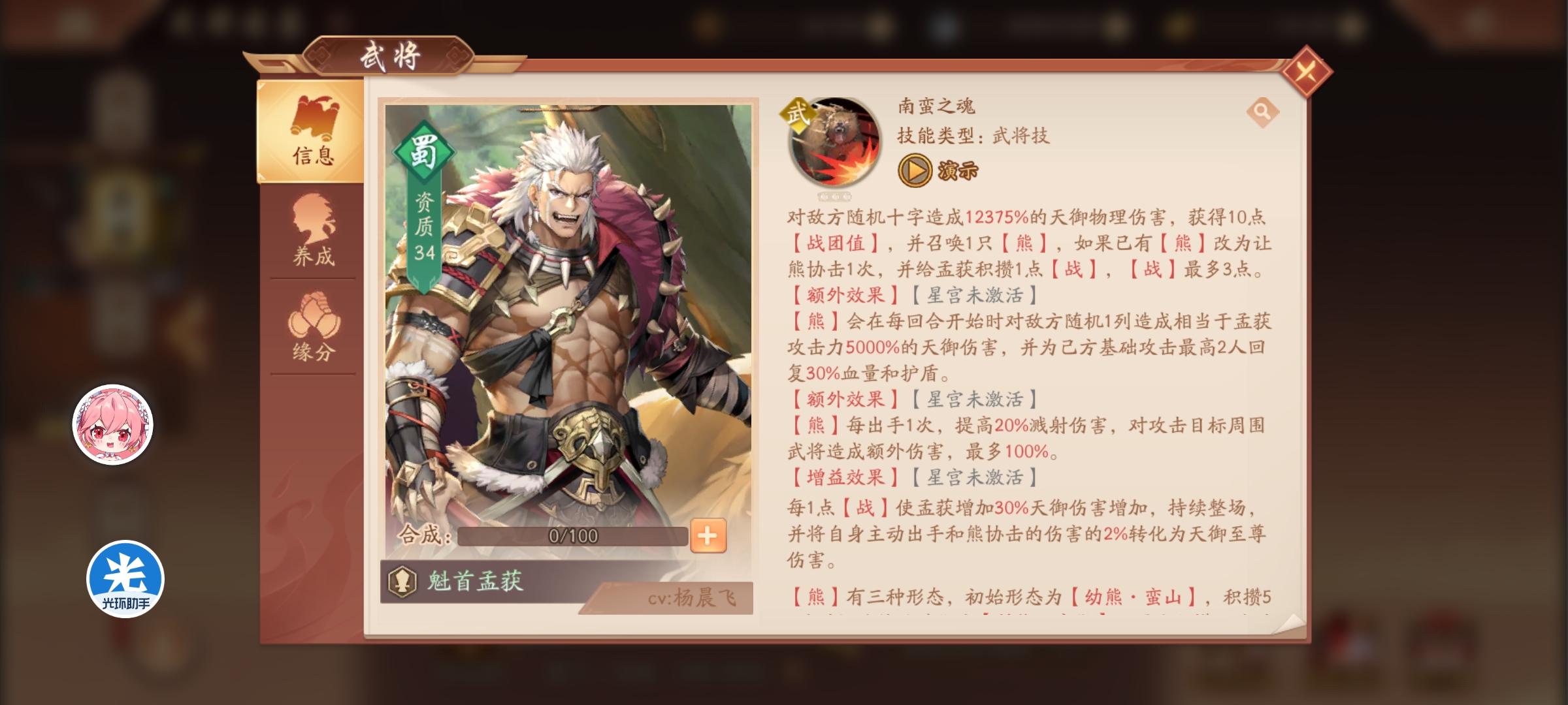 幼熊蛮山对敌随机一列造成孟获攻击5000%的天御伤害,回复孟获30%生命值,加50经验。