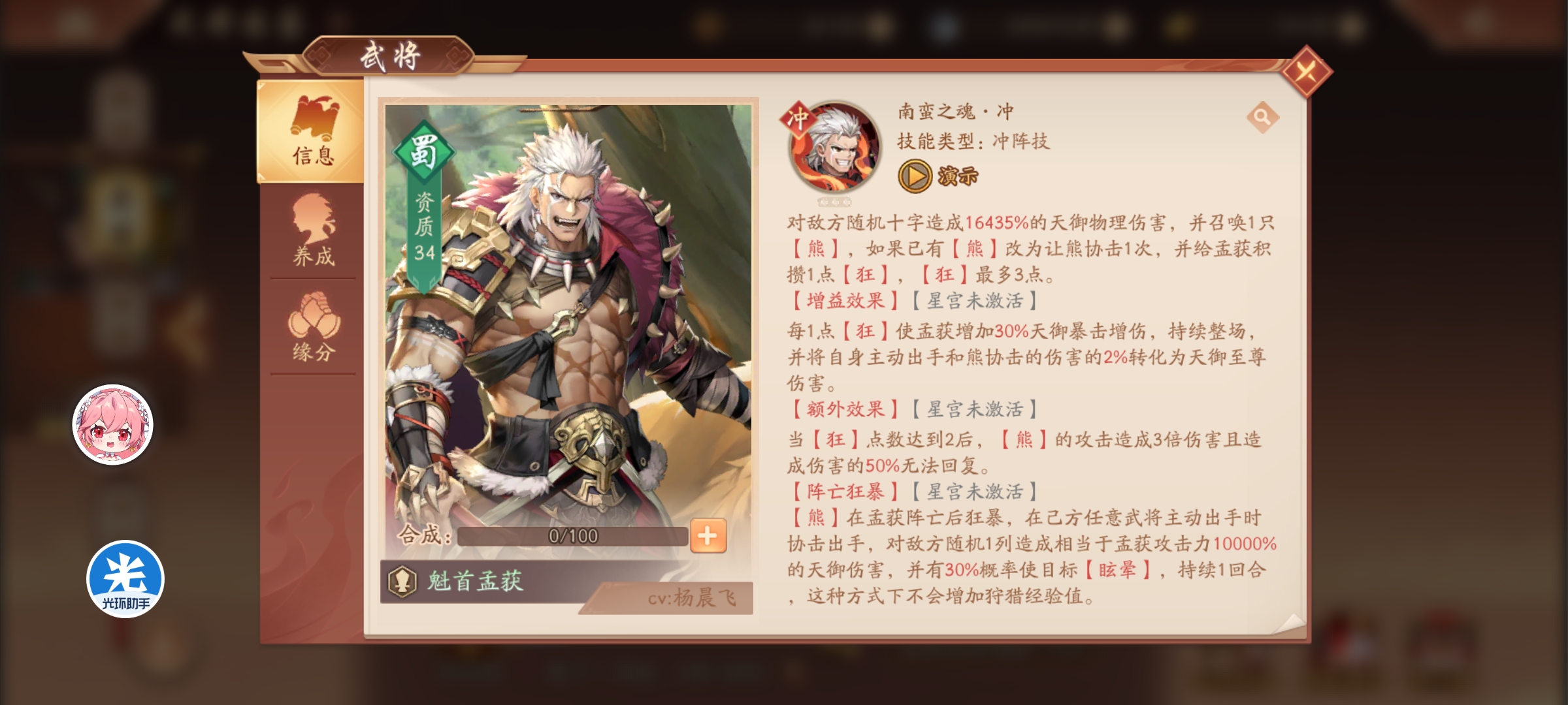 狂:每1点狂加孟获20%天御暴击率持续整场。