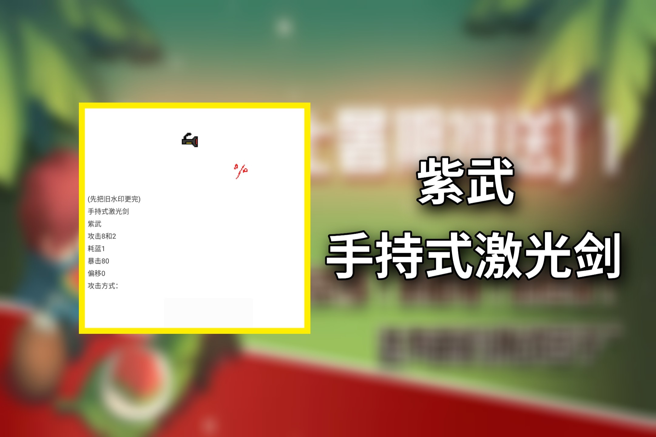 武器属性:手持式激光剑 紫武 攻击2-8 耗蓝1 暴击80 偏移0
