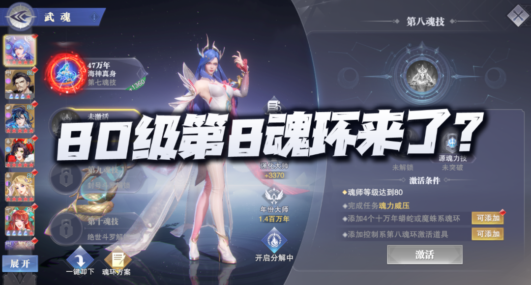 所以针对绝大部分玩家而言,在到达了80级后,即便你能顺利的开启第八魂环,可能短期内也只能享受到其中的一个觉醒魂技效果,此外例如源魂力技和真身技由于普遍需要达到源魂6级与彩色5星真身的前提,就这个就需要时间的慢慢积累了.....急不来急不来。所以这个姗姗来迟的第八魂环的确有些让人失望的味道,就看官方后续有没有进一步优化调整的措施了。