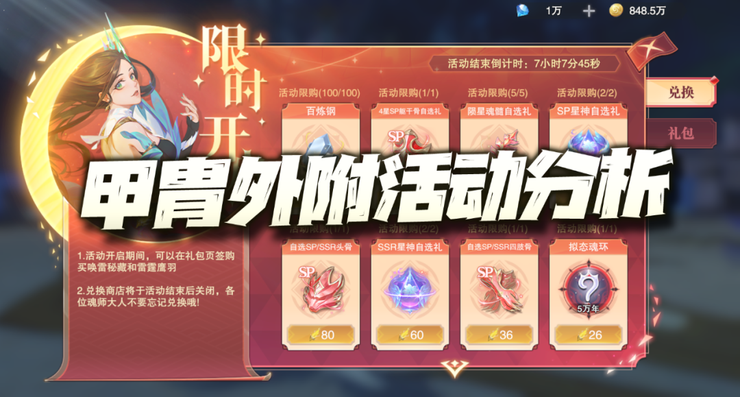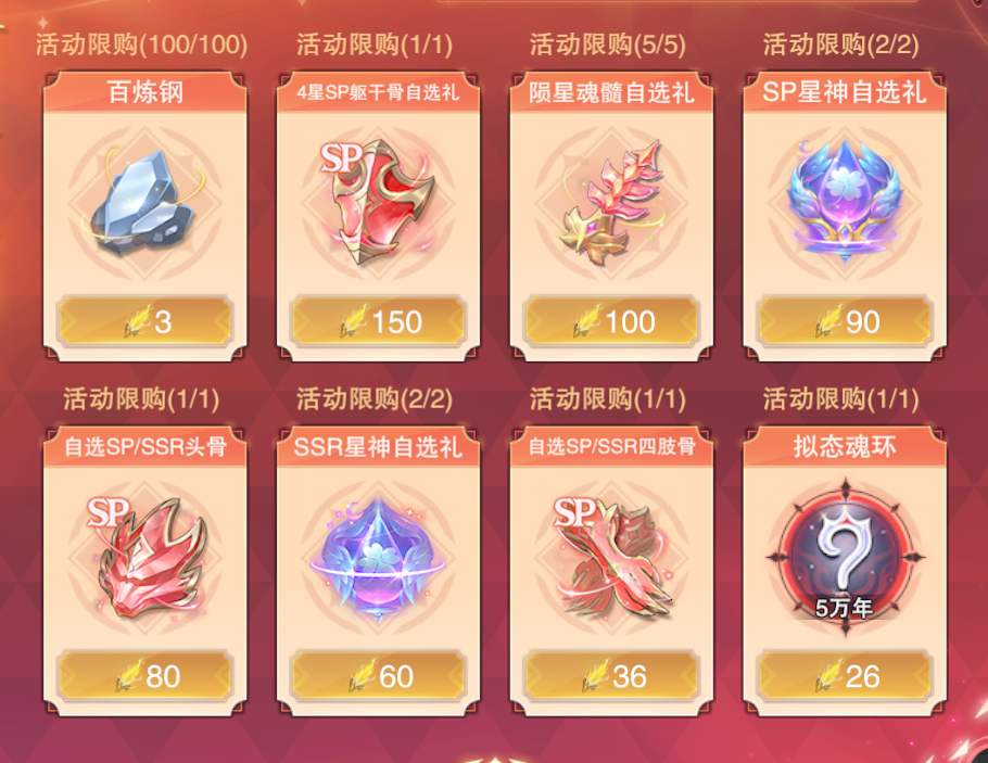 最后针对这一堆东西应该换啥的问题,其实宗旨还是缺啥就换啥,其中例如百炼钢是万能解,你实在不知道换啥了就换这个也可以,其次急缺魂骨星级的可以考虑几个星神,甚至是最后的武魂觉醒券也可以考虑,反正这个商店因为东西特别少,没啥特别可说的。
