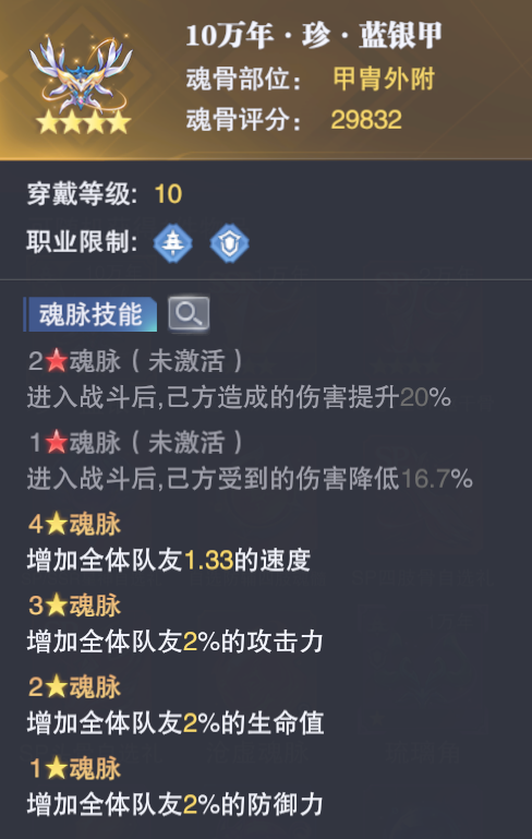 那么首先这个防辅系的甲胄外附魂骨,其特色和之恰的强攻、敏攻与控制系外附魂骨也比较类似,黄色1-4星分别是提升全队队友的防御、攻击、生命和速度,而关键则在于这个红色1星和红色2星的魂脉质变效果,其中红色1星为降低己方的受到伤害,而红色2星则是提升己方造成的伤害。