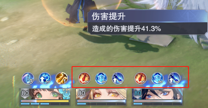通过实战我们可以发现,在佩戴了甲胄外附魂骨的防辅系魂师上阵情况下,我方魂师的头上会出现一把剑与一个盾牌的图标,持续时间无限,那么这两个图标便是这块外附魂骨中红色1星的减伤和红色2星的增伤图标。