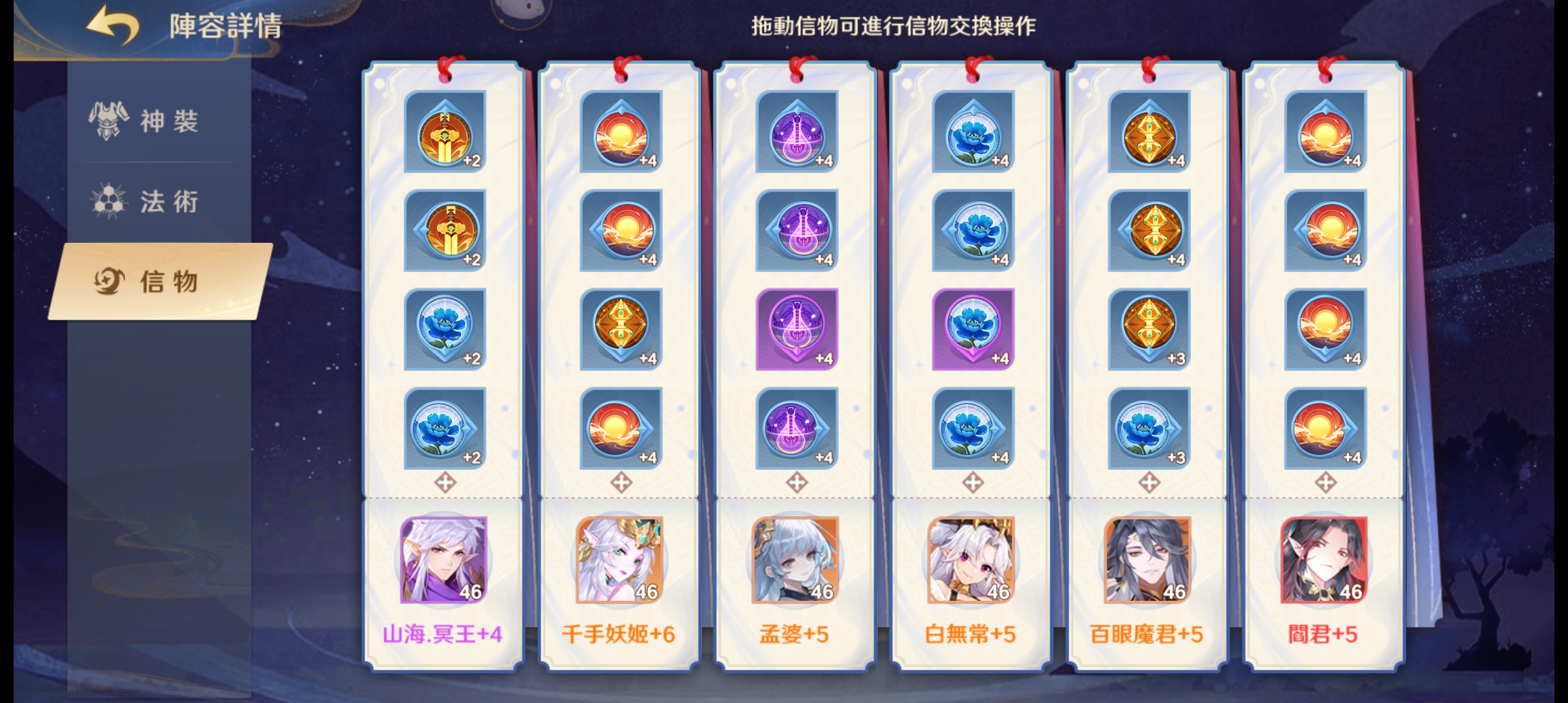 ㅤ信物方面还是两套必备,其他的混搭。毕竟现在信物还不齐全。法术的话,再抽到一次太白就可以做出来了,忘川法术对阎君的作用也很大,不过我想试玩一下纯输出流。