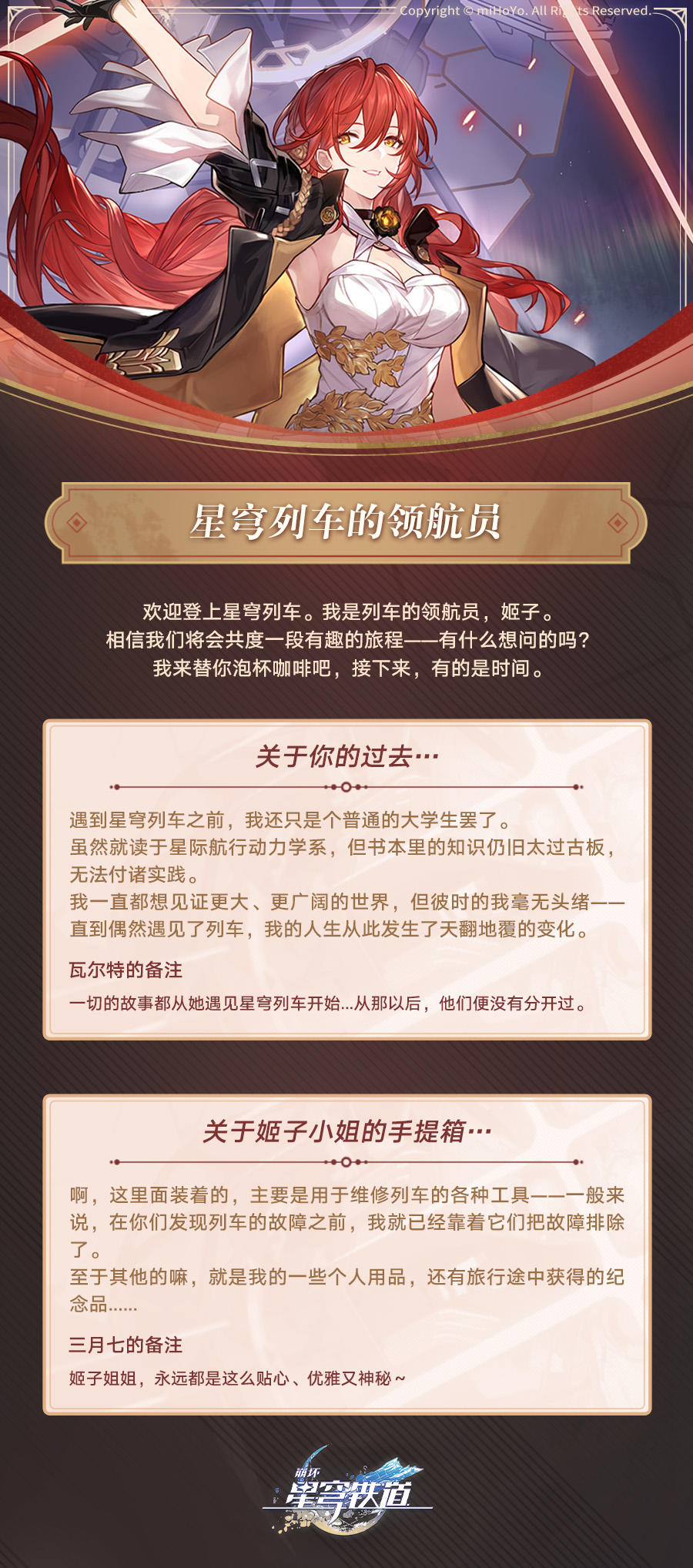 崩坏:星穹铁道角色介绍 | 姬子吃货酱酱发布于 2023-04-10关注 欢迎登上星穹列车。我是列车的领航员,姬子。相信我们将会共度一段有趣的旅程——有什么想问的吗?我来替你泡杯咖啡吧,接下来,有的 是时间。