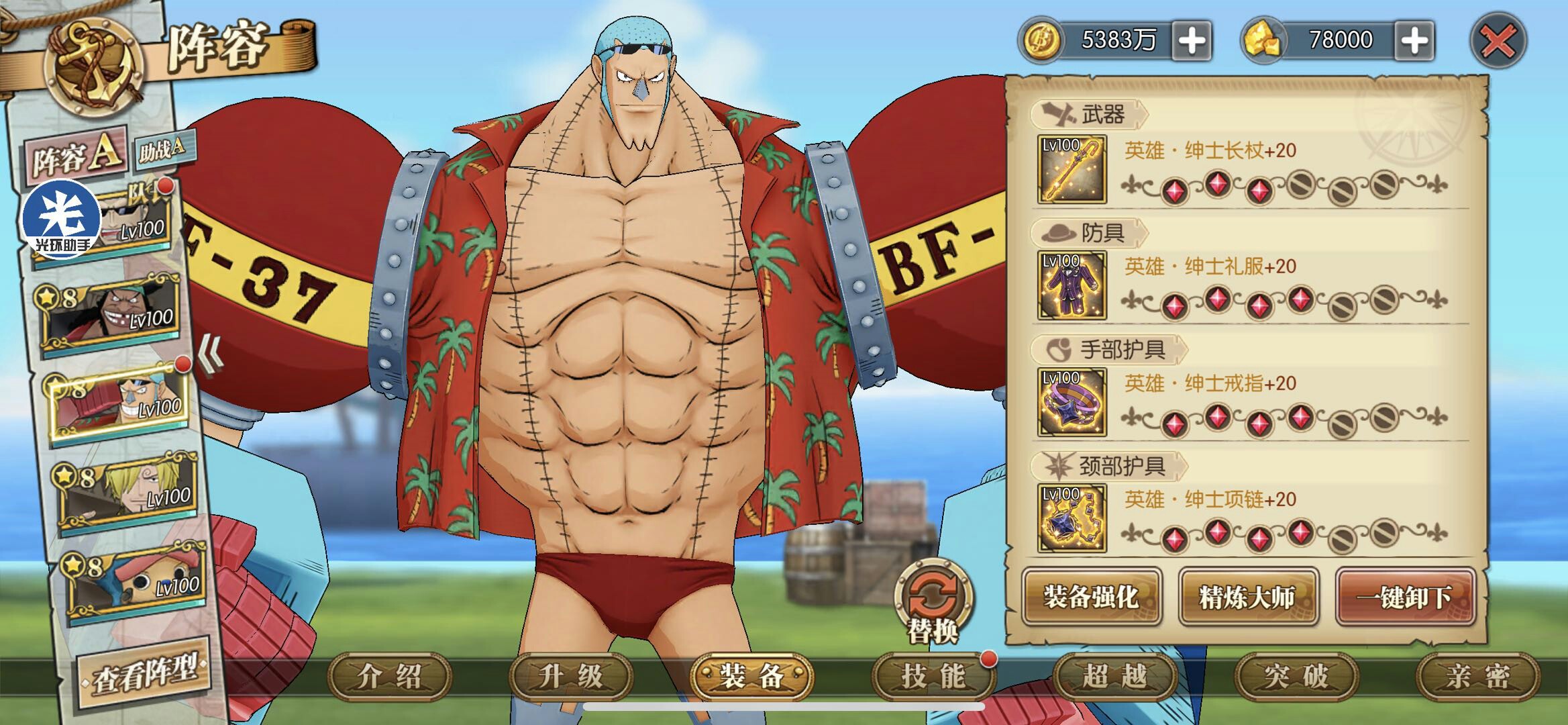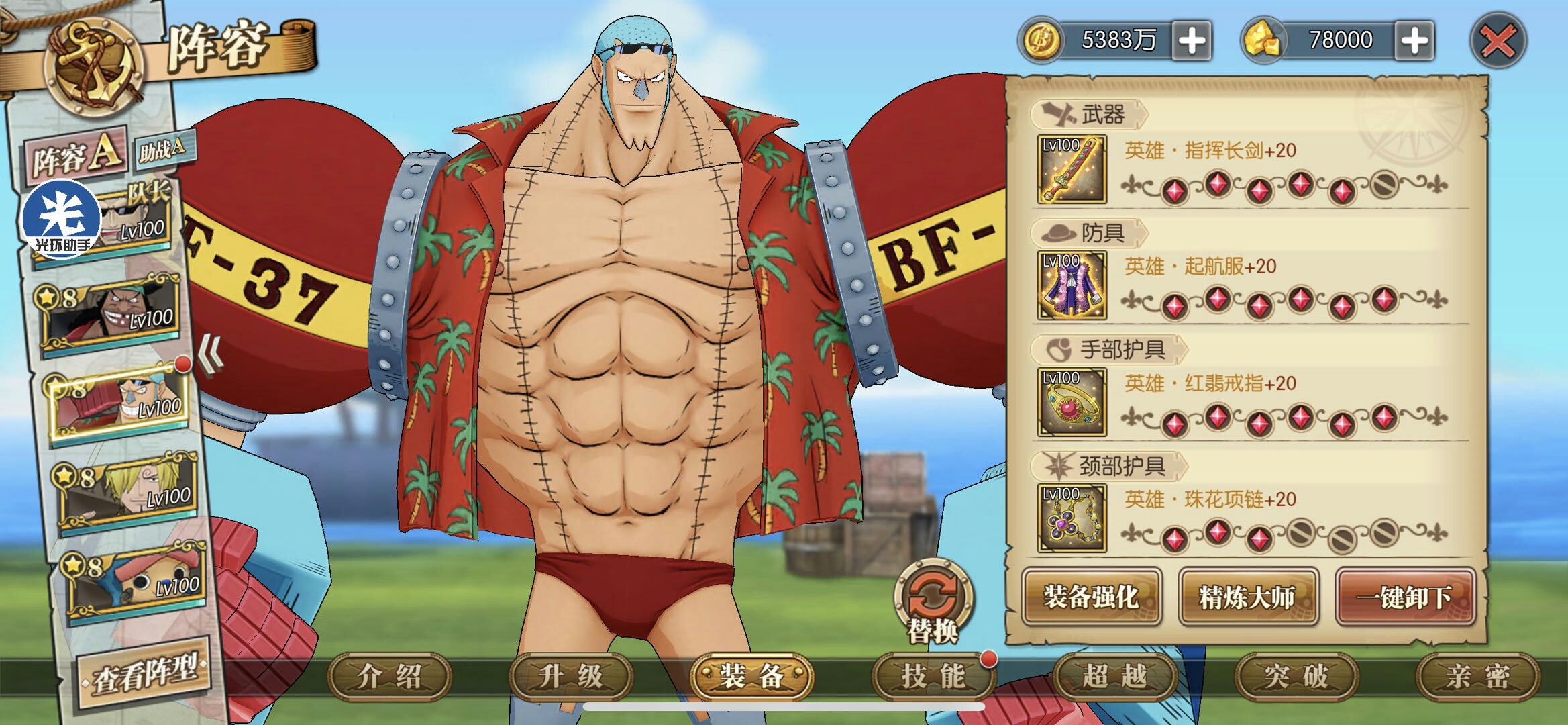 <技能顺序>首回合只用5魂风来炮+奥义变身,剩余2魂玉配合乔巴给予的额外2魂和第二回合恢复的7魂,第二回合可以有10魂释放5魂主动+5魂终结(需要不点工匠天赋,否则需要碰运气换妹子头或枪头),由于走的是暴击路线,加上高额攻击提供的属伤,两回合内可以打出极为恐怖的爆炸伤害!且弗兰奇的生存明显优于路飞,同样是第三回合“虚弱/过载”,比起路飞第二回合的单体,弗兰奇更让人眼前一亮。船长路飞完全可以在当前版本光荣退役。