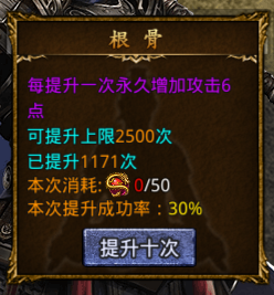1、消耗龙骨可提升根骨等级,升级后可增加攻击