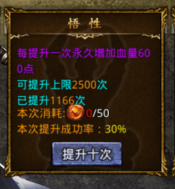 1、消耗凤魂可提升悟性等级,升级后可增加生命值