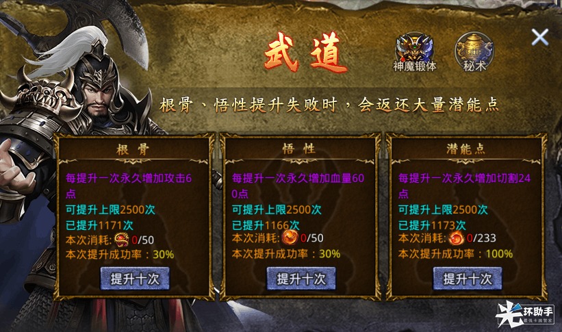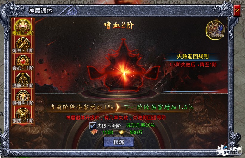 2、消耗元宝可修炼提升神魔等级;神魔锻体升级时,有几率失败,失败将回退等级,可以消耗灵符来使失败不降级