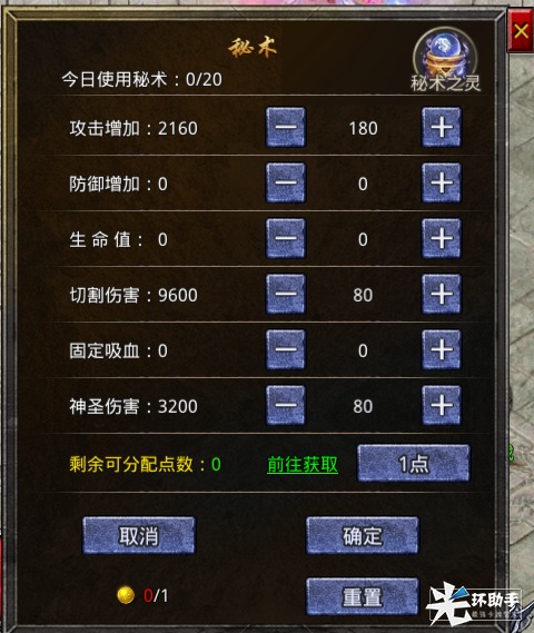 2、每天可使用秘术的次数为20次,根据以获得的分配点数数量可以激活秘术之灵阶数,提升对战增伤、受战减伤、武道效果提升等属性