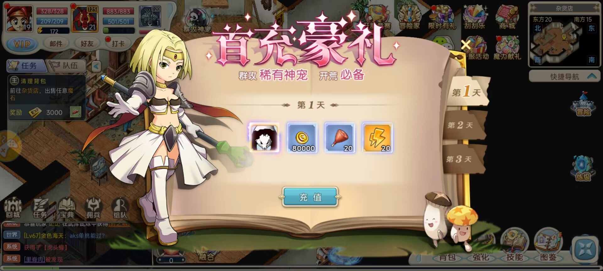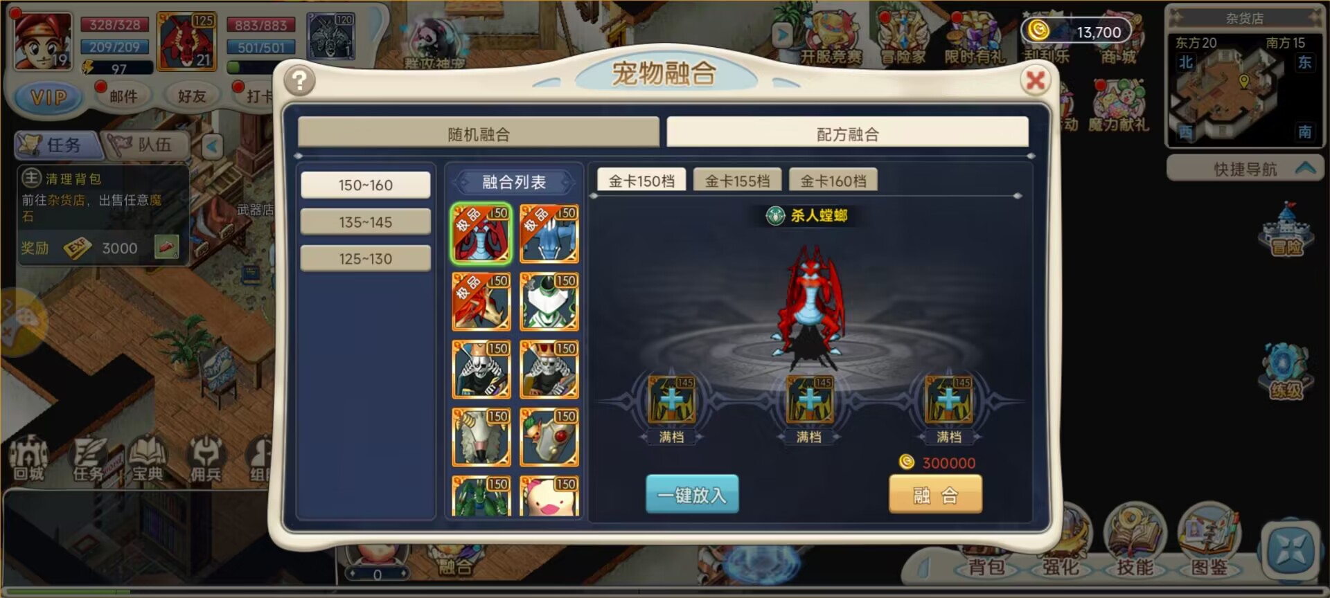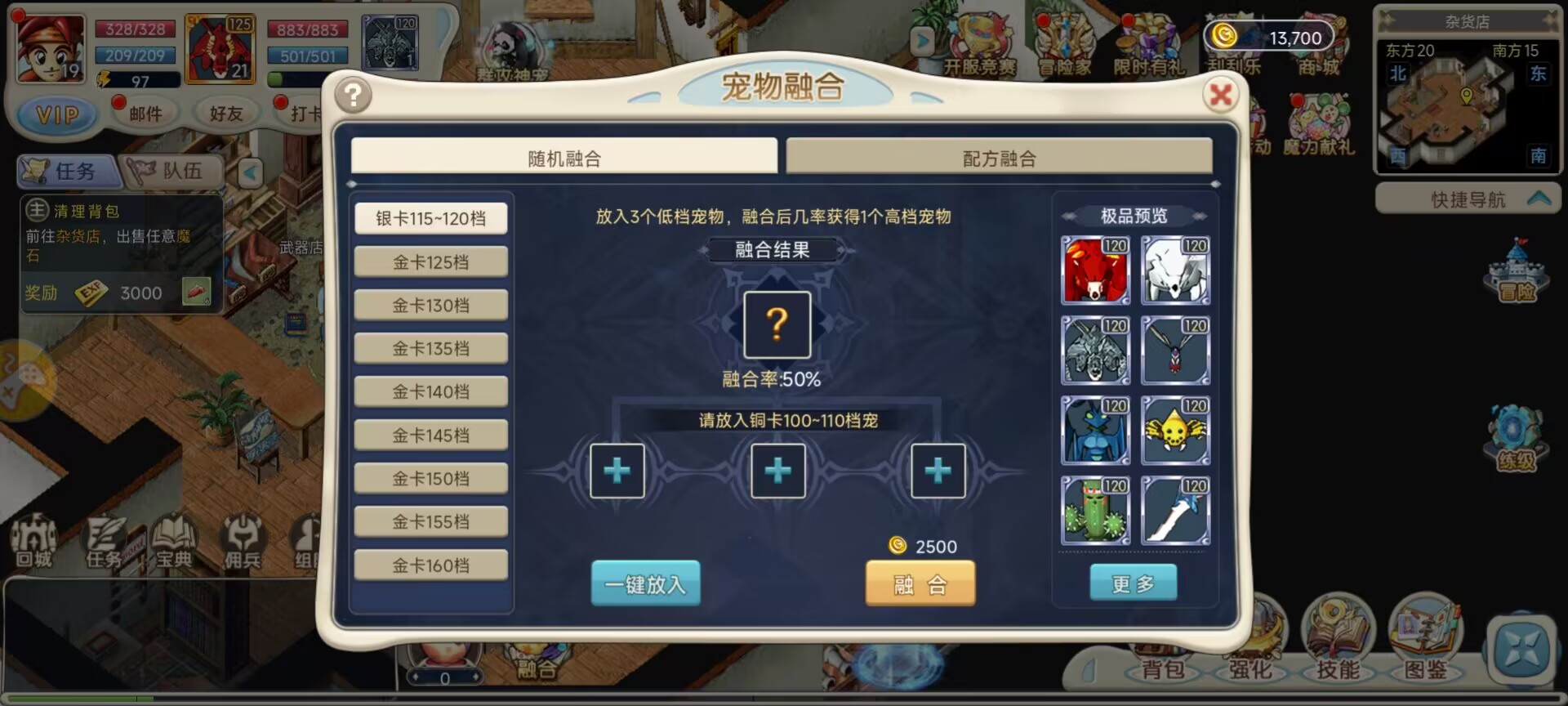 可以看到游戏左下角有一个融合,打开后有一个随机融合一个配方融合。随机融合有50%失败的概率,但是没有宠物限制,适合那些心急气躁的玩家;配方融合则适合那些稳中求胜的玩家了。小编自己玩了一会就有了一个金宠,还有就是首充大礼包的宠物只能作为合成材料,着实可怜,倒是别的材料还能入眼。