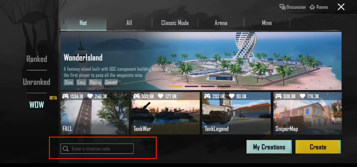 进入WOW地图创意工坊,在下图红框这输入以上代码即可找到地图~,快快区地图工坊体验吧~