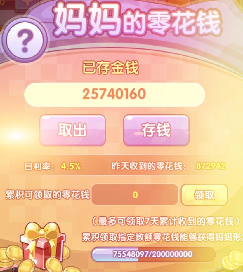这里都没有装满,你就取出来。每天得的利息也只会更少。不如装满了每天领取最多的。先把精灵的培养那些缓一缓。得从长计议!!
